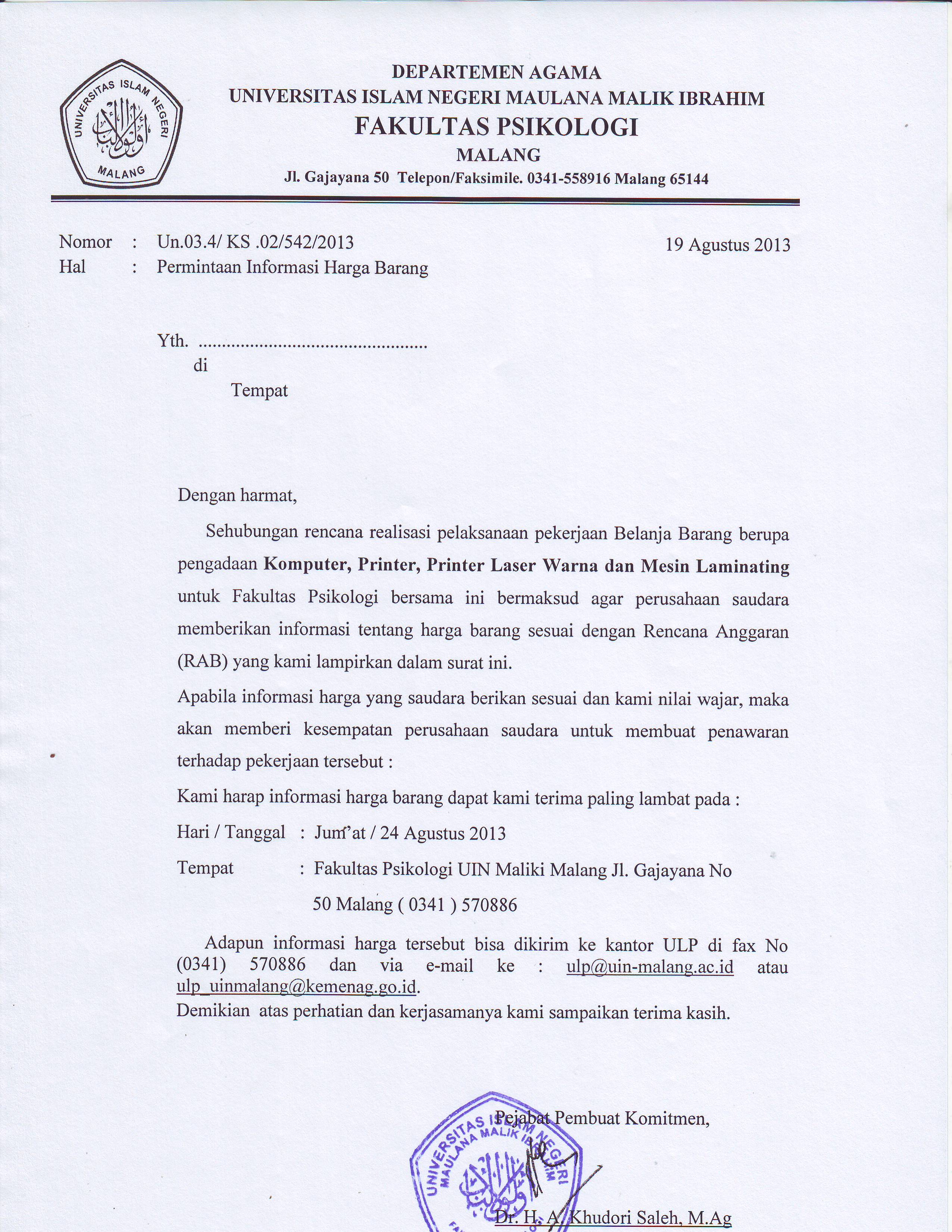 Sehubungan rencana realisasi pelaksanaan pekerjaan Belanja barang Fakultas Psikologi UIN Maliki Malang, bersama ini kami mohon kepeda penyedia barang/jasa untuk dapat memberikan informasi harga barang tersebut. file bisa di download di bawah ini;